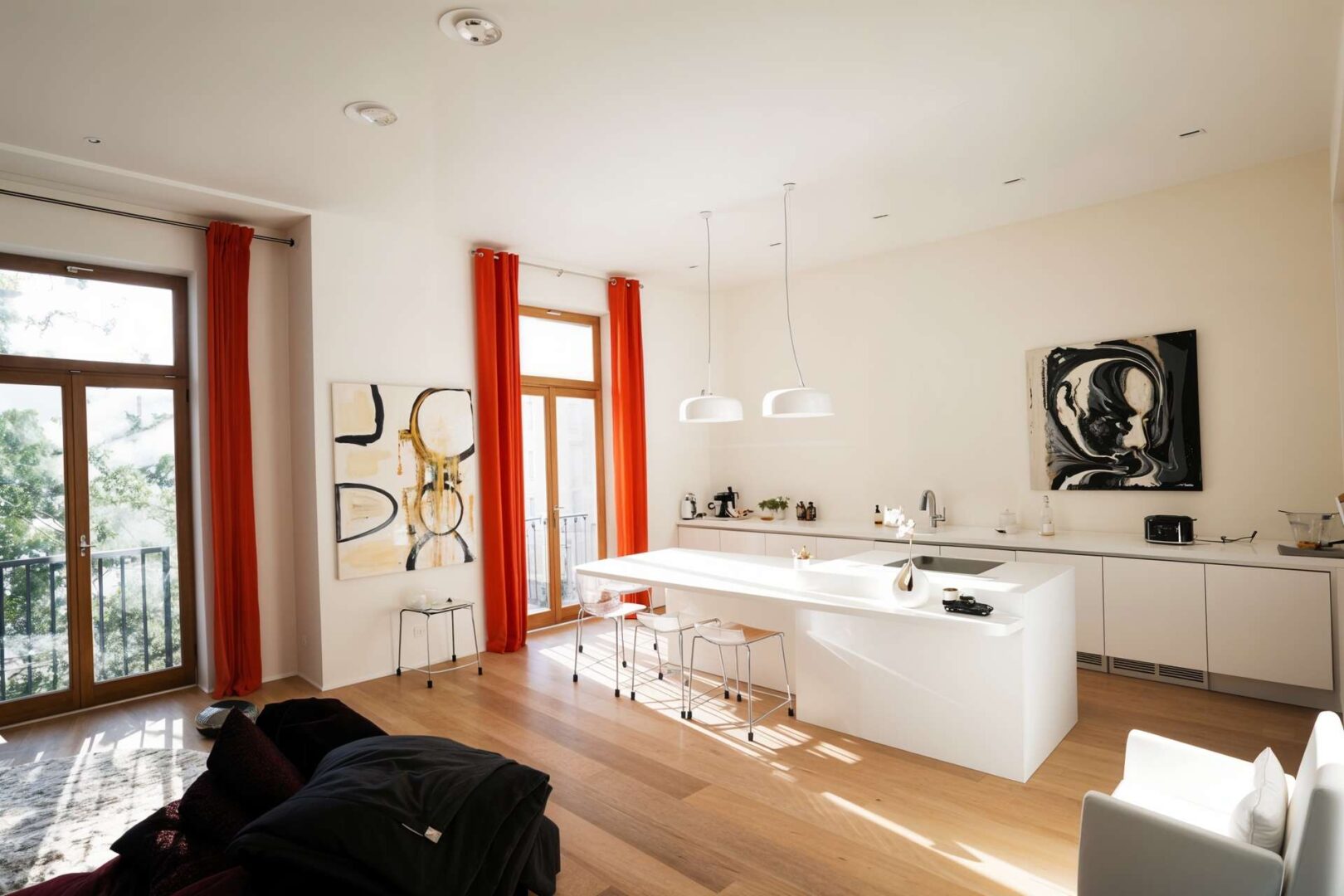 Die Raumwirkung ist außergewöhnlich: frei, großzügig, fließend und zugleich elegant zurückhaltend. Ein Wohngefühl, das an internationale Designapartments erinnert – mitten in Berlin.