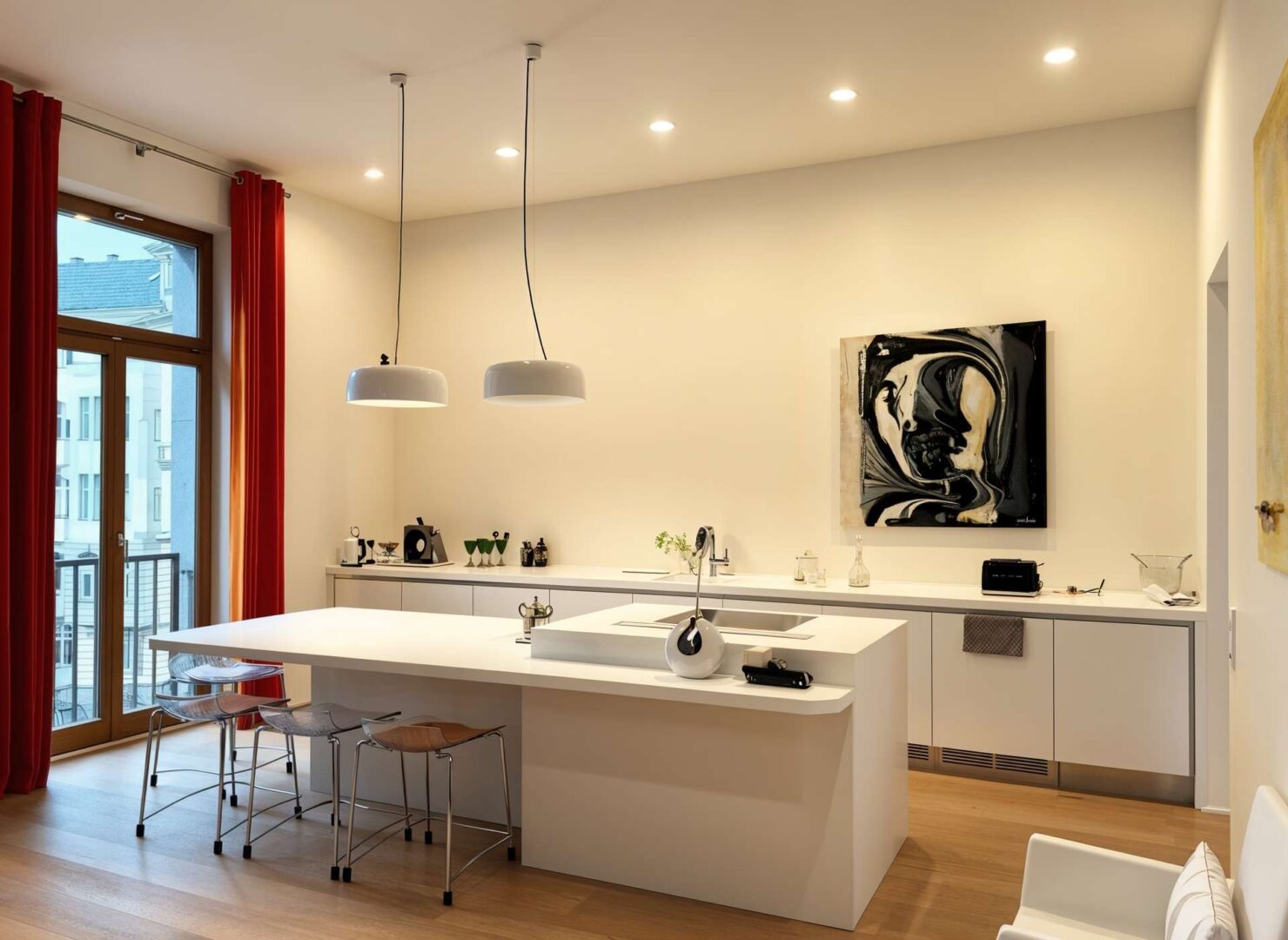 Die elegante, puristisch gehaltene offene Küche, die bis heute unbenutzt ist, fügt sich harmonisch in den Raum ein – perfekt für Designliebhaber und alle, die gerne kochen und Gäste empfangen. Die klare Formsprache, das dezente Weiß und die hochwertige Ausstattung verleihen der Küche einen fast skulpturalen Charakter.